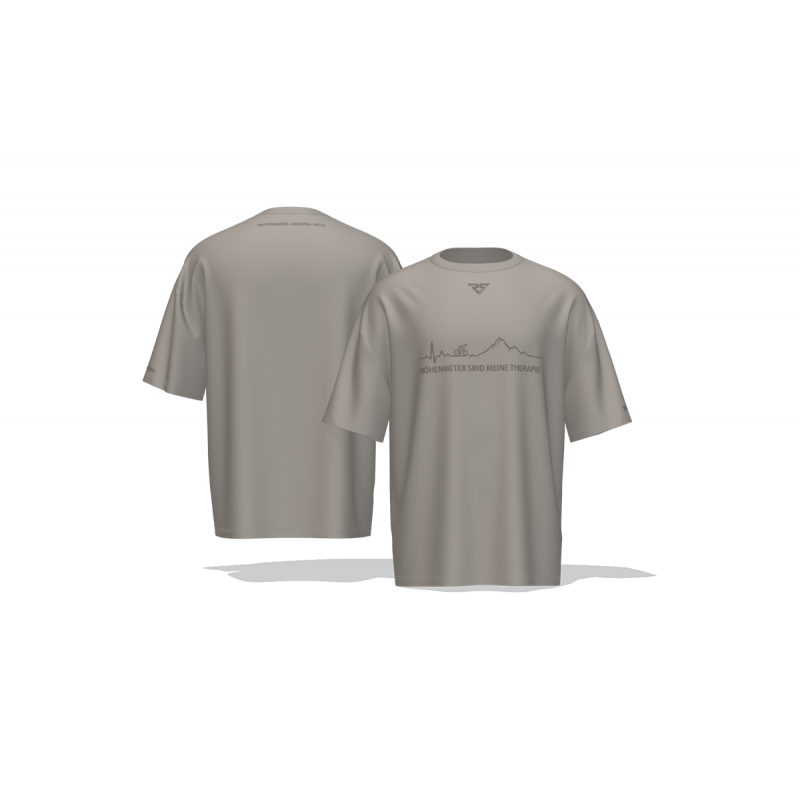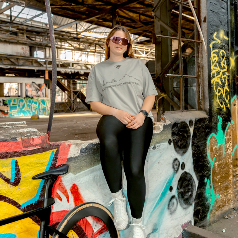 Der minimalistische Print mit Bergsilhouette und dem Statement „Höhenmeter sind meine Therapie“ bringt genau dieses Gefühl auf den Punkt. Ein Shirt für alle, die im Sattel abschalten, den Kopf freibekommen und ihre Energie auf der Straße oder im Gebirge finden.